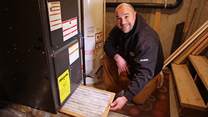 Smart HomeownerOver here is your water heater. It actually is connected to your heating system. The piping actually goes through down there, and it acts like another zone of heat that you have in your home. It runs off of its own thermostat. It's called an aquastat, which is a control on the side over there, and that works the same way as a thermostat in the rest of your home, gets to a certain temperature, it shuts off the pump, and it stops heating your water. The water from your heating system here goes through that, and it heats indirectly for your domestic hot water for your bathing, so you have some nice hot water.